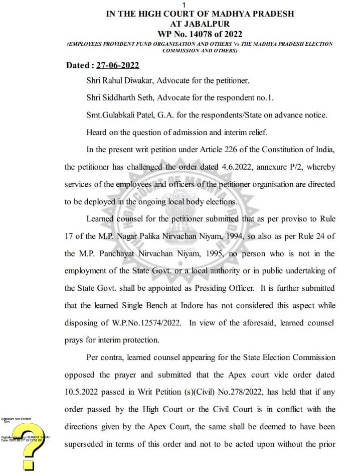 दरअसल,हाल ही में ईपीएफओ आर्गनाइजेशन की ओर से मध्य प्रदेश हाई कोर्ट में एक याचिका दायर की गई थी। याचिकाकर्ताओं की तरफ से अधिवक्ता राहुल दिवाकर ने पैरवी करते हुए कोर्ट को बताया कि 4 जून 2022 को याचिकाकर्ता संगठन के कर्मचारियों व अधिकारियों को चुनाव ड्यूटी करने के लिए आदेश जारी किया गया। जबकि नियमानुसार राज्य सरकार, स्थानीय निकायों व लोक स्थापनाओं के कर्मियों, अधिकारियों की ही स्थानीय निकाय चुनाव में ड्यूटी लगाई जा सकती है, क्योंकि याचिकाकर्ता न तो राज्य सरकार के कर्मी हैं और न ही केंद्र सरकार के।