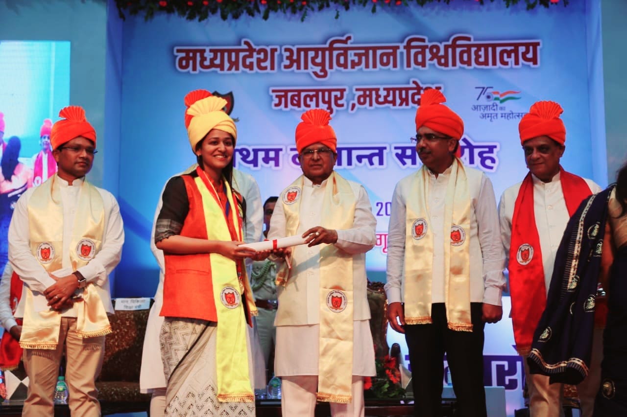 मध्य प्रदेश आयुर्विज्ञान विश्वविद्यालय यानि मप्र मेडिकल यूनिवर्सिटी जबलपुर का पहला दीक्षांत समारोह आज मानस भवन में आयोजित किया गया। राज्यपाल मंगू भाई पटेल ने 75 स्टूडेंट्स को डिग्रियां और मेडल सौंपे। कार्यक्रम के मुख्य अतिथि चिकित्सा शिक्षा मंत्री विश्वास सारंग थे।