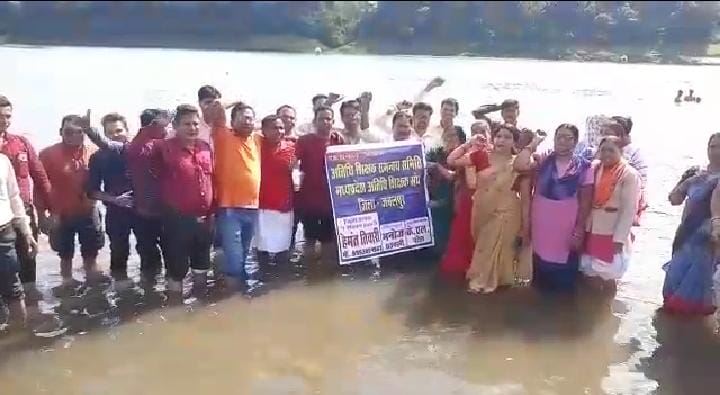 जबलपुर, संदीप कुमार। मध्यप्रदेश (MP) में लंबे समय से, नियमितिकरण की मांग कर रहे अतिथि शिक्षकों (Guest Teachers) ने आज जबलपुर (Jabalpur) में अलग ढंग से विरोध जताया, अतिथि शिक्षक आज जबलपुर में नर्मदा नदी के ग्वारीघाट (Gwarighat) पहुंचे जहां उन्होने नदी में उतरकर जल सत्याग्रह किया। नदी में उतरे अतिथि शिक्षकों ने सरकार के खिलाफ जमकर नारेबाज़ी की और उन्हें नियमत करने की मांग के साथ जल-सत्याग्रह किया।