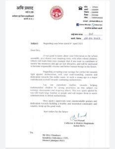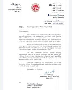 कलेक्टर ने एक बार फिर दोनों बच्चों को पत्र लिखकर उनके विचारों और प्रयासों को सराहा है। उन्होंने दोनों बच्चों को संबोधित करते हुए लिखा कि, “उन्हें यह जानकर बहुत खुशी हुई कि स्कूल द्वारा उनका सम्मान किया गया और उनके योगदान की कहानी को असेंबली में बताकर दूसरे बच्चों को भी प्रेरित किया गया।” उन्होंने दोनों बच्चों की मंशा का सम्मान करते हुए उनकी बचत राशि के आग्रह को स्वीकार करते कहा कि, “आपके प्रयास से लोगों को जिम्मेदार नागरिक और एक अच्छा इंसान बनने की प्रेरणा मिलेगी। उन्होंने पत्र के जरिए बच्चों का मार्गदर्शन करते हुए कुपोषित बच्चों की मदद के लिए इस विषय में लिखकर और चर्चा कर लोगों को प्रेरित करने की बात कहते हुए उन्होनें ने लिखा कि, “इस तरह से आप अधिक से अधिक लोगों में अलख जला सकते हैं, साथ ही कुपोषण के खिलाफ जंग में प्रशासन के सहभागी बनने प्रेरित कर सकते हैं। कलेक्टर ने दोनों बच्चों के उज्जवल भविष्य की कामना भी की।”