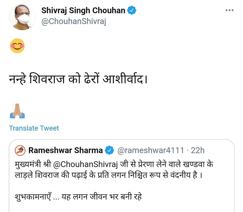 खंडवा, सुशील विधानी। मुख्यमंत्री शिवराज सिंह चौहान (CM Shivraj singh chouhan) ने ट्वीट कर घोड़ी पर स्कूल जाने वाले बालक शिवराज यादव को बधाई दी है। उन्होने अपने ट्विटर हैंडल पर लिखा है “नन्हें शिवराज को ढेरों आशीर्वाद।”
