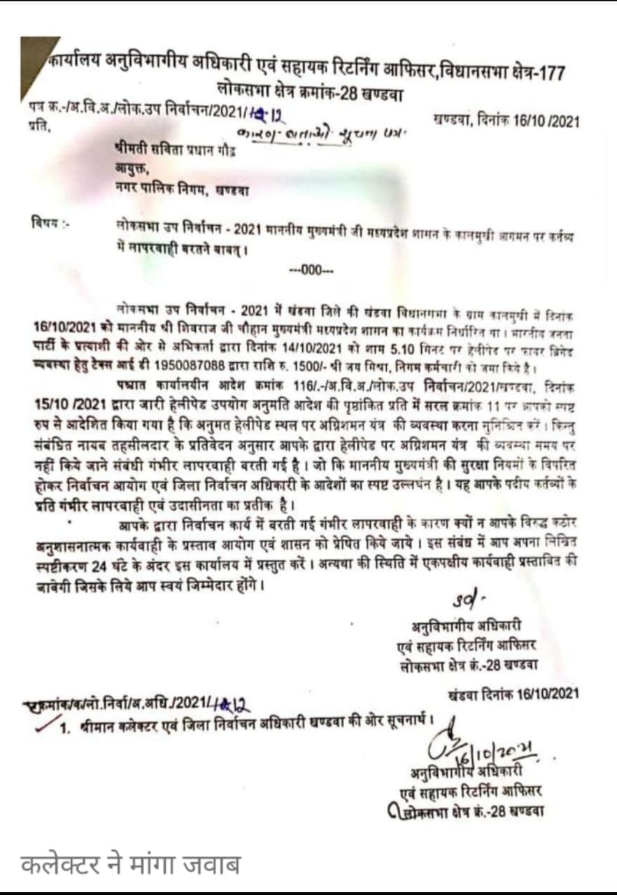 शनिवार को मुख्यमंत्री शिवराजसिंह चौहान खण्डवा लोकसभा उपचुनाव के सिलसिले में खण्डवा जिले के ग्राम कालमुखी आये थे जहाँ हेलिपैड पर अग्निशमन व्यवस्था के लिये नगर निगमायुक्त खण्डवा को निर्देशित किया गया था । इसके लिये आयोजकों द्वारा आवश्यक राशि भी निगम कोष में जमा करा दी गई थी बावजूद इसके वहाँ मुख्यमंत्री के हेलीकॉप्टर की लैंडिंग तक फ़ायर ब्रिगेड की व्यवस्था नही हो सकी । यह मुख्यमंत्री की सुरक्षा में बड़ी लापरवाही है । इसके लिये आज ही सहायक रिटर्निंग ऑफिसर एवं एसडीएम ने कलेक्टर के आदेश पर निगमायुक्त को नोटिस जारी करते हुए उनके विरूद्ध सख्त कार्यवाही की चेतावनी दी है । उन्हें 24 घंटे के भीतर अपना जवाब देने को आदेशित किया गया है अन्यथा एकपक्षीय कार्यवाही के लिए चेतावनी दी है।