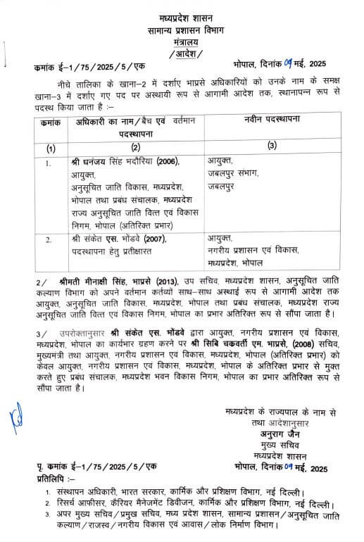 सामान्य प्रशासन विभाग द्वारा 9 मई 2025 को जारी आदेश के अनुसार, आईएएस अधिकारी संकेत एस. भोंडवे को आयुक्त, नगरीय प्रशासन एवं विकास विभाग, मध्यप्रदेश, भोपाल पदस्थ किया गया है। 2006 बैच के आईएएस धनंजय सिंह भदौरिया, जो अब तक आयुक्त, अनुसूचित जाति विकास और प्रबंध संचालक, अनुसूचित जाति वित्त एवं विकास निगम, भोपाल का अतिरिक्त प्रभार संभाल रहे थे, को आयुक्त, जबलपुर संभाग के पद पर स्थानांतरित किया गया है।