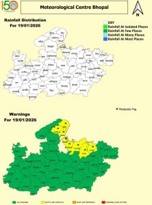 - मौसम विज्ञान केंद्र (IMD), भोपाल की दैनिक रिपोर्ट के मुताबिक, वर्तमान में एक पश्चिमी विक्षोभ और एक चक्रवातीय परिसंचरण सक्रिय है। पश्चिमी जेट स्ट्रीम औसत समुद्र तल से 12.6 किमी की ऊंचाई पर पूर्वोत्तर भारत के ऊपर सक्रिय है। दो पश्चिमी विक्षोभ क्रमिक रूप से 19 जनवरी 2026 की रात तथा 21 जनवरी 2026 की रात से उत्तर- पश्चिम भारत को प्रभावित करने की संभावना है।
