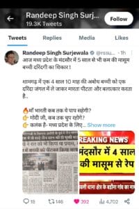 मंदसौर में 5 साल की बच्ची के बलात्कार को लेकर कांग्रेस पार्टी के प्रदेश प्रभारी रणदीप सुरजेवाला ने अपने ट्विटर अकाउंट से ट्वीट किया।