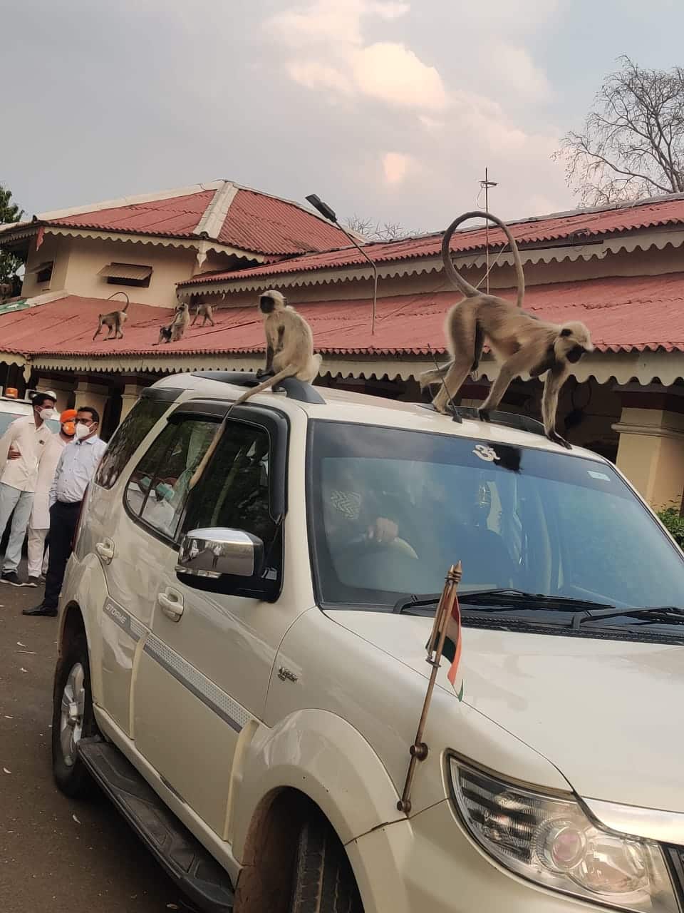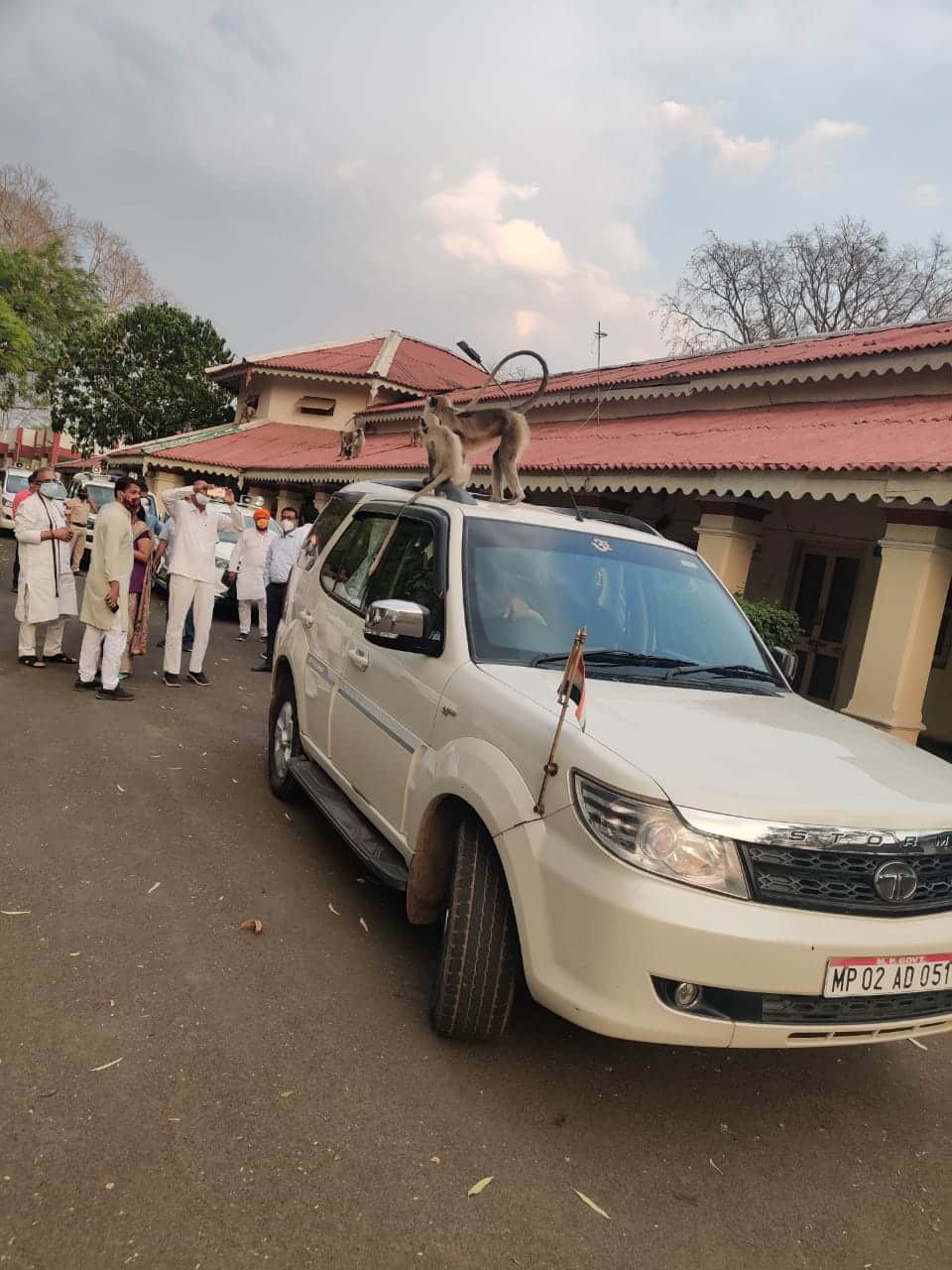 नजारा था मंदसौर के सर्किट हाउस का। यहां पर जिले में कोरोना संक्रमण को लेकर बैठक चल रही थी और बैठक में मौजूद थे प्रदेश के नवीन एवं नवीकरणीय ऊर्जा मंत्री हरदीप सिंह डंग। साथ में क्षेत्र के सांसद, विधायक, कलेक्टर और एसपी भी मौजूद थे। जाहिर सी बात है कि जब इतने सारे वीवीआइपी मौजूद हो तो वहां पत्ता भी कैसे खड़क सकता है। भारी सुरक्षा के बीच मंत्रीजी का लाव लश्कर सर्किट हाउस के बाहर मौजूद था, जिसमें उनकी सरकारी सफारी गाड़ी भी थी। लेकिन यह क्या, तमाम सुरक्षा इंतजामों को धता बताते हुए वहां पर आ धमके कुछ बंदर और बेखौफ चढ़ गए मंत्री जी की गाड़ी पर। सुरक्षाकर्मियों ने बंदरों को हड़काया तो पहले तो वो चले गए लेकिन दुबारा आ गए। इतनी देर में मंत्री जी जब बाहर निकले तो उन्होंने भी यह नजारा देखा और उनके साथ सभी मौजूद लोगों ने जमकर ठहाके लगाए।