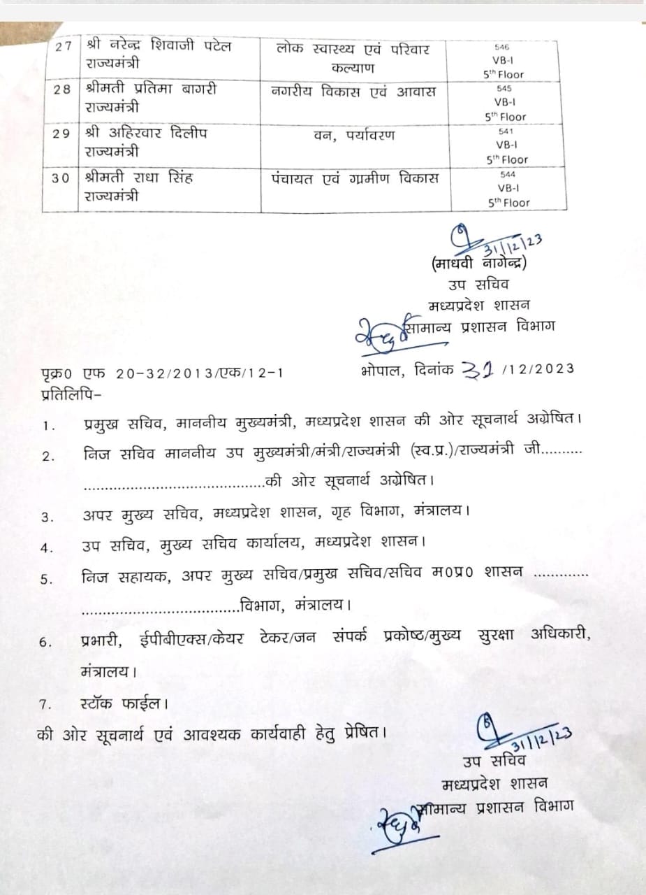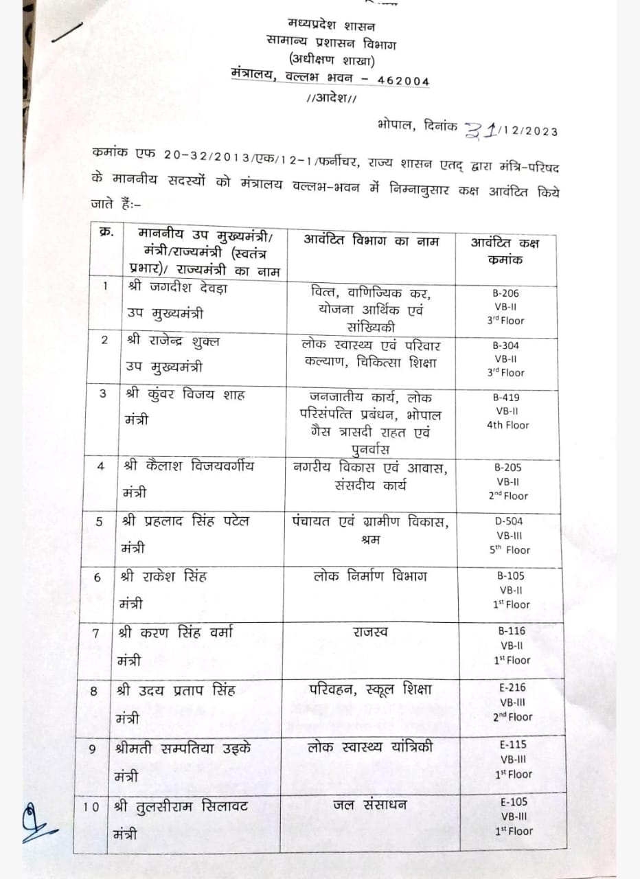 MP Minister Room Allotted: मोहन मंत्रिमंडल के नए मंत्रियों (Mohan Cabinet Minister) को विभागों के बंटवारे के बाद अब मंत्रालय में नवीन व्यवस्थाओं से कक्ष भी आवंटित कर दिए गए हैं। राज्य के सामान्य प्रशासन विभाग द्वारा इस संबंध में जारी आदेश की प्रति हम यहां दे रहे हैं जिसमें किस मंत्री को कौन सा नया कक्ष आवंटित हुआ है , उसका स्पष्ट उल्लेख है। इससे पहले 28 कैबिनेट और राज्य मंत्रियों को विभागों की जिम्मेदारी दी गई थी।
