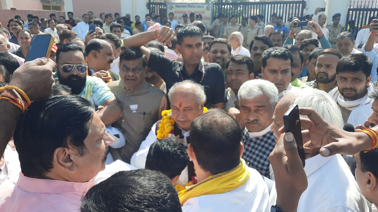 केंद्रीय कृषि मंत्री नरेंद्र सिंह तोमर को आज अपने समर्थकों के साथ निर्वाचन कार्यालय पहुंचकर रिटर्निंग ऑफिसर को अपना नामांकन फॉर्म सौंपा, उन्होंने मीडिया से बात करते हुए कहा कि जनता सच और झूठ का अंतर समझती है, कांग्रेस को सिर्फ भ्रम फैलाना आता है झूठ बोलना आता लेकिन भाजपा विकास और जन कल्याण के लिए राजनीति करती है, उन्होंने कहा कि मध्य प्रदेश में भारी बहुमत के साथ भाजपा की सरकार बनेगी।