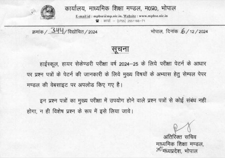 माध्यमिक शिक्षा मंडल, मध्य प्रदेश, भोपाल द्वारा जारी की गई सूचना में लिखा है कि, हाईस्कूल, हायर सेकेण्डरी परीक्षा वर्ष 2024-25 के लिये परीक्षा पेटर्न के आधार पर प्रश्न पत्रों के पेटर्न की जानकारी के लिये मुख्य विषयों के अभ्यास हेतु सेम्पल पेपर मण्डल की वेबसाइट पर अपलोड किए गए है। इन प्रश्न पत्रों का मुख्य परीक्षा में उपयोग होने वाले प्रश्न पत्रों से कोई संबंध नही होगा, न ही विशेष प्रश्न के रूप में इसे लिया जावे।