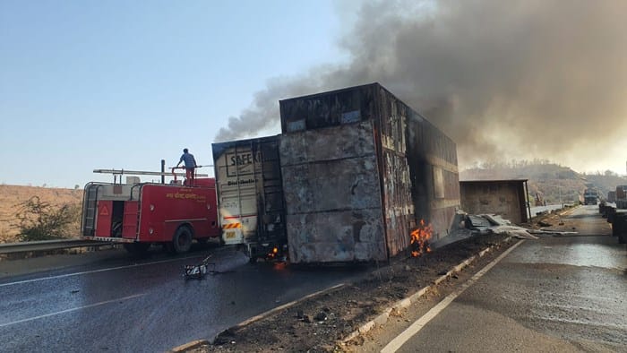 कार से भरे कंटेनर सहित अन्य एक वाहन में भी भीषण आग लग गई। इस आग में दो लोगों के जिन्दा जलने की खबर आ रही है। इस हादसे के बाद आसपास के क्षेत्रों में हड़कंप मच गया।