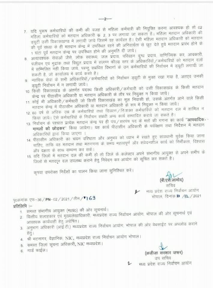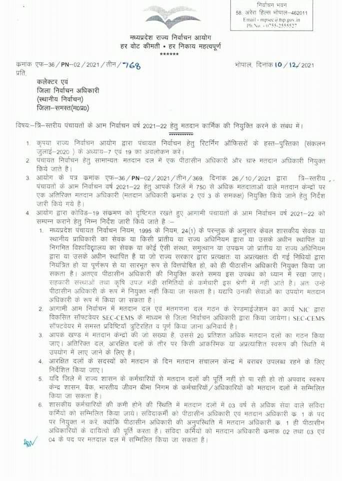 भोपाल, डेस्क रिपोर्ट। मध्य प्रदेश में पंचायत चुनावों (MP Panchayat Election 2021) की तैयारियां जोरों पर चल रही है। राज्य निर्वाचन आयोग जिला निर्वाचन अधिकारियों के लिए जरुरी दिशा निर्देश जारी कर रहा है। आयोग ने निर्देश जारी करते हुए कहा है कि 60 वर्ष से अधिक उम्र के कर्मचारियों और दिव्यांग कर्मचारियों की ड्यूटी मतदान दलों में नहीं लगाई जाये। साथ ही यदि पुरुष कर्मचारियों की कमी हो तभी महिला कर्मचारियों की ड्यूटी मतदान दल में लगाई जाये।