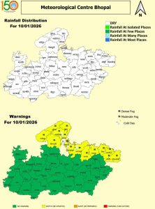 ग्वालियर, खजुराहो (छतरपुर) और दतिया जिलों में घना कोहरा छाया रहा। शनिवार सुबह भी ग्वालियर, श्योपुर, मुरैना, भिंड, शिवपुरी, दतिया, निवाड़ी, टीकमगढ़, छतरपुर, पन्ना, सतना, रीवा, मऊगंज, सीधी और सिंगरौली में घना कोहरा देखने को मिला। कोहरे के चलते सुबह के समय सड़कों पर वाहनों की रफ्तार धीमी बनी हुई है। दिल्ली से मध्य प्रदेश आने-जाने वाली मालवा एक्सप्रेस, पंजाब मेल, जनशताब्दी और सचखंड एक्सप्रेस निर्धारित समय से देरी से चल रही हैं। मौसम विज्ञान केंद्र, भोपाल के मुताबिक, शनिवार (10 जनवरी 2026) को दतिया, निवाड़ी, टीकमगढ़ और छतरपुर में कोल्ड डे की स्थिति बनी रह सकती है।