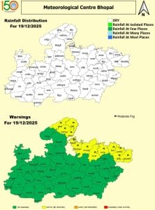 MP Weather Forecast : आज शुक्रवार को एक नया पश्चिमी विक्षोभ सक्रिय होने वाला है जिसके असर से हवाओं का रूख बदलेगा और ठंड का असर तेज होगा। 19 दिसंबर को एक दर्जन से ज्यादा जिलों में शीतलहर व घने कोहरे का अलर्ट जारी किया गया है।इसका ज्यादा असर मालवा-निमाड़ और ग्वालियर चंबल संभाग में देखने को मिलेगा।