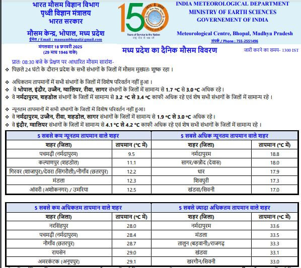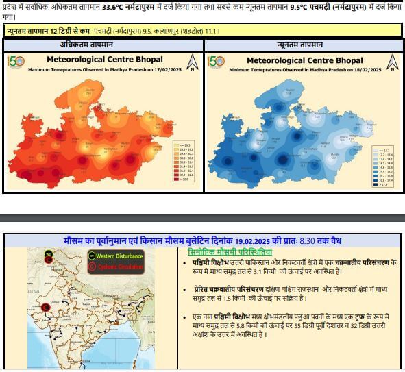 एमपी मौसम विभाग के मुताबिक, फरवरी के आखिरी तक वेस्टर्न डिस्टरबेंस सक्रिय रहने के कारण तापमान में उतार-चढ़ाव की स्थिति बनी रहती है। 19 फरवरी को भोपाल, इंदौर, उज्जैन-जबलपुर में मौसम साफ रहेगा। ग्वालियर संभाग में बादल छा सकते है।20 फरवरी को दिन-रात के तापमान में वृद्धि देखने को मिलेगी।21 फरवरी को पूर्वी हिस्से में मेघगर्जन के साथ बारिश की स्थिति बन सकती है।