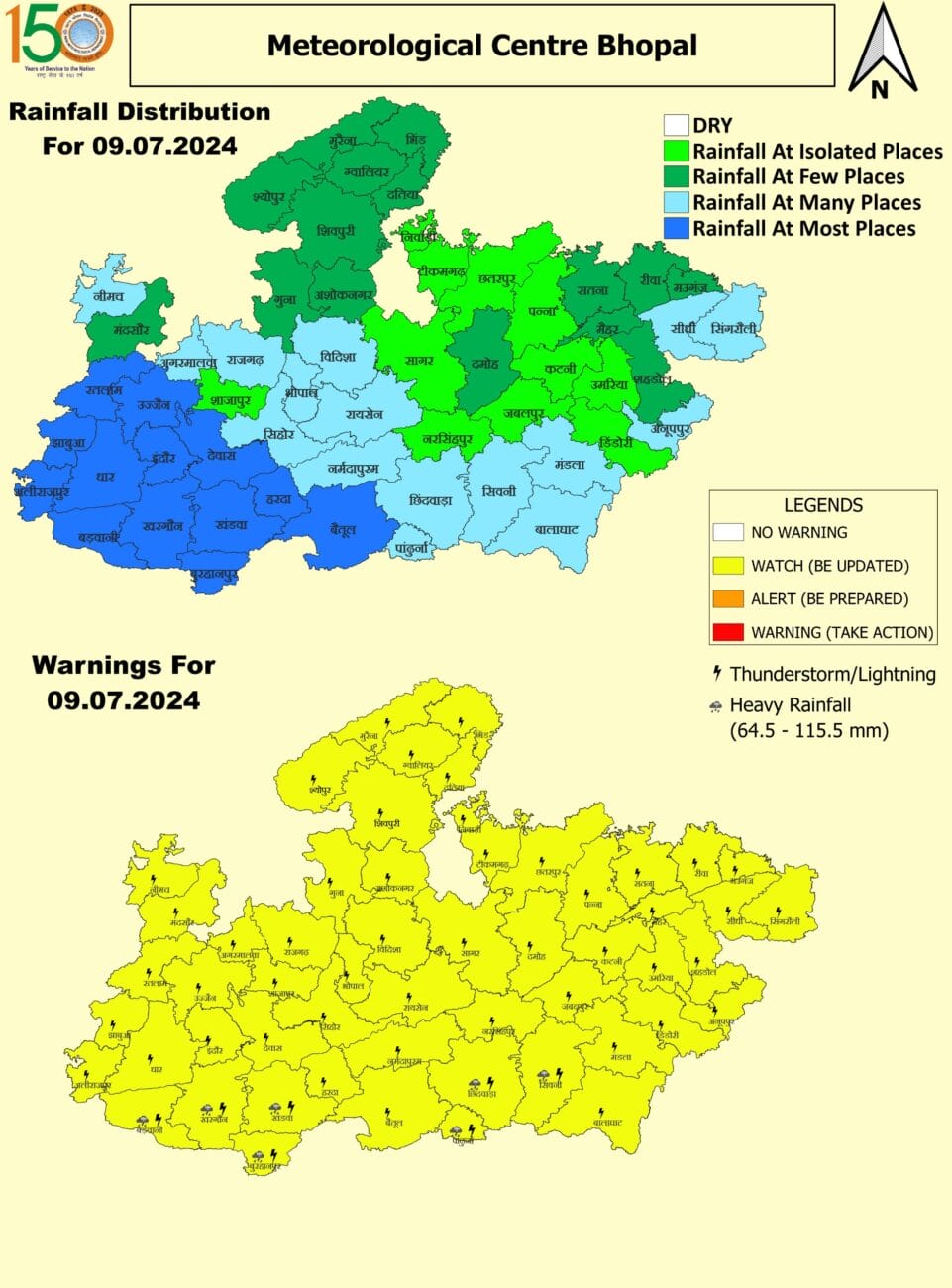 एमपी मौसम विभाग ने श्योपुर, गुना, शिवपुरी, राजगढ़, शाजापुर, खरगोन, खंडवा, बुरहानपुर, निवाड़ी, टीकमगढ़, सागर, छिंदवाड़ा, पांढुर्णा, सिवनी, मंडला, बालाघाट, अनूपपुर सहित कई जिलों में बारिश का अलर्ट जारी किया है। इसमें बड़वानी, खरगोन और झाबुआ में भारी वर्षा/बिजली गिरने और अलीराजपुर, खंडवा, बुरहानपुर में मध्यम गरज के साथ बौछारें की संभावना है। धार/मांडू, बैतूल, महेश्वर, मुरैना, श्योपुर कलां, पंढुर्ना और पूर्वी विदिशा में हल्की गरज के साथ बौछारें पड़ने की संभावना है।