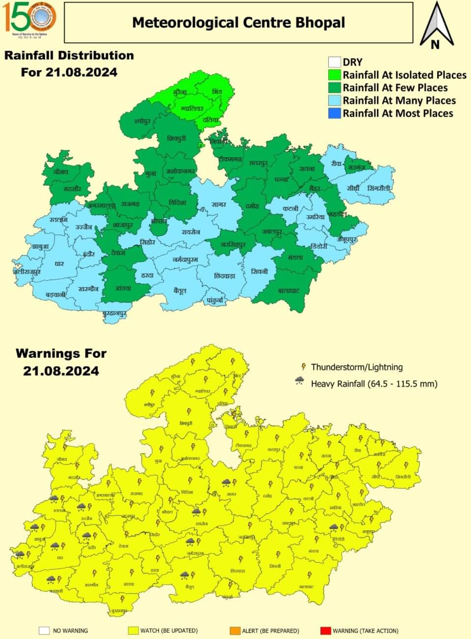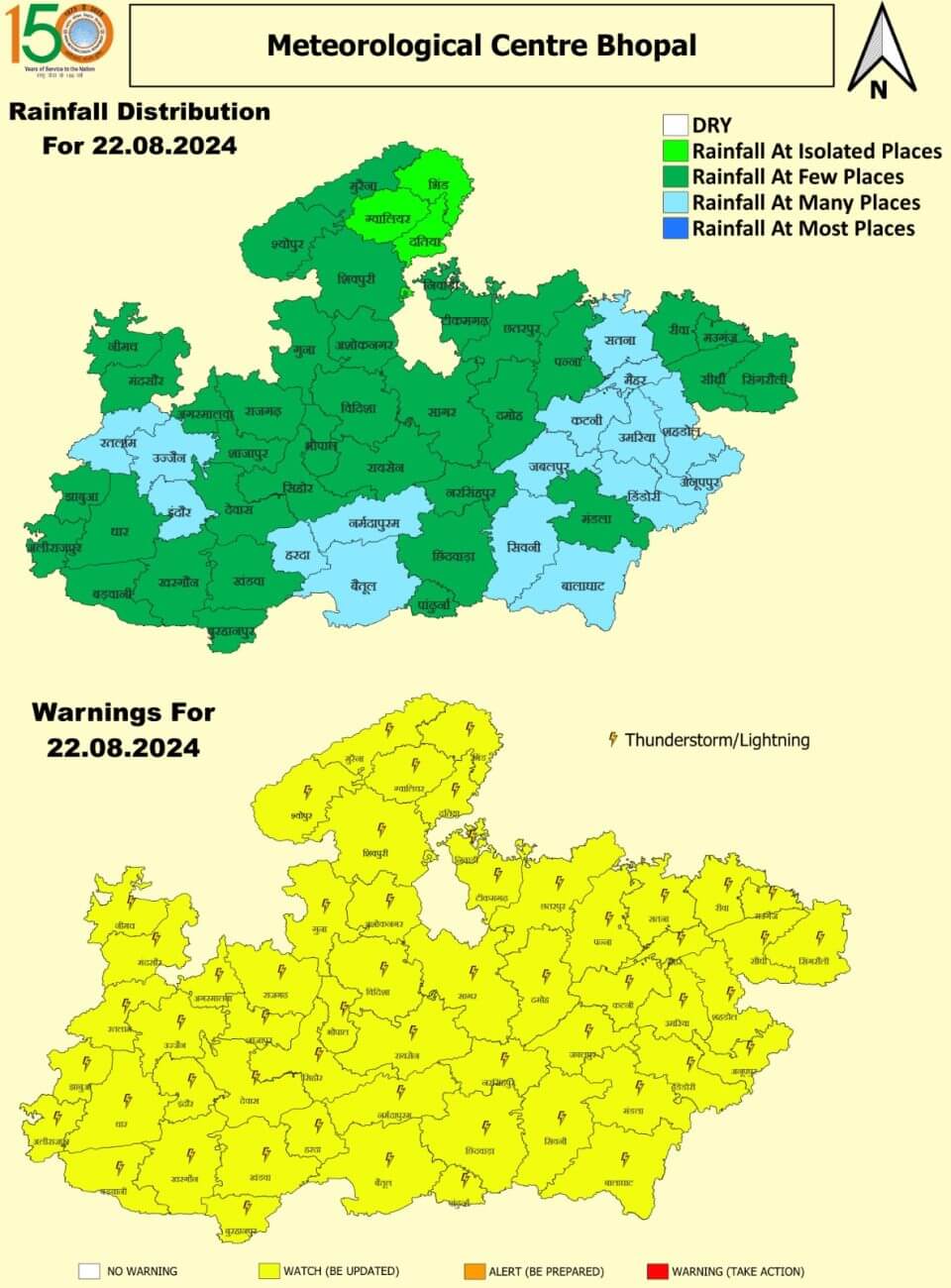 - विदिशा, सीहोर, नर्मदापुरम, बैतूल, खरगोन, बड़वानी, अलीराजपुर, धार, इंदौर, नीमच, गुना, अशोकनगर, भिंड, श्योपुर, अनूपपुर, छिंदवाड़ा, मंडला, बालाघाट और पांढुर्णा में भी तेज बारिश का यलो अलर्ट जारी किया है।