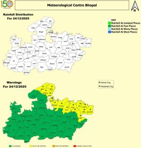 भोपाल मौसम केन्द्र (IMD) के मुताबिक, अगले पांच दिनों तक प्रदेश में मौसम शुष्क और साफ बना रहेगा और बारिश की कहीं कोई संभावना नहीं है। अगले एक दो दिनों में घने कोहरे का असर कम होगा लेकिन ठंड बरकरार रहेगी। न्यूनतम तापमान में 2 से 3 डिग्री तक की गिरावट आ सकती है। आज बुधवार को भोपाल में रात का तापमान लगभग 7 से 8 डिग्री, इंदौर में 6 से 7 डिग्री, जबलपुर में करीब 9 डिग्री और ग्वालियर में 8 से 11 डिग्री के बीच रह सकता है।