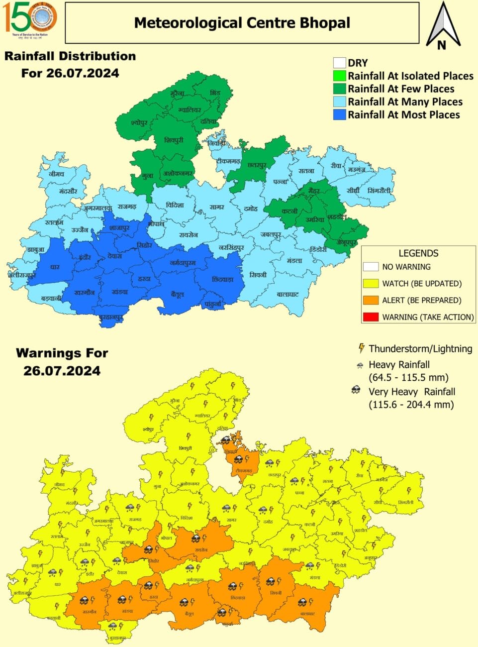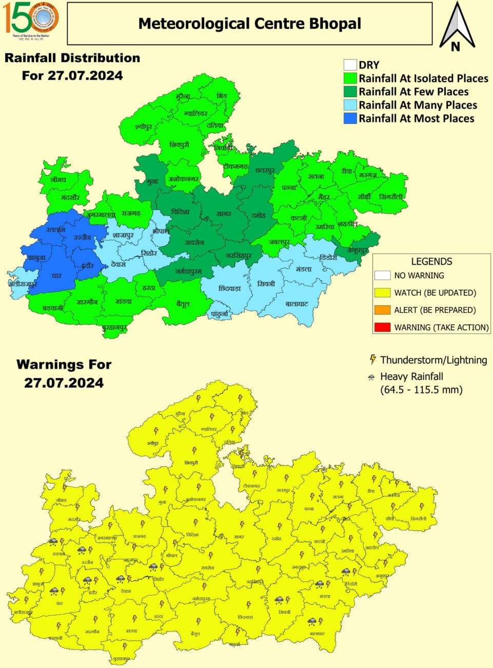 एमपी मौसम विभाग की मानें तो प्रदेश में अगले दो दिनों तक मौसम विभाग ने ज्यादातर जिलों में भारी और अति भारी बारिश के आसार है। 27 और 28 जुलाई को ज्यादातर जिलों में भारी और अति भारी बारिश की संभावना है। 28 जुलाई से फिर एक नया स्ट्रॉन्ग सिस्टम एक्टिव होने जा रहा है, जिसका प्रभाव 29 और 30 जुलाई को उत्तरी हिस्से में देखने को मिलेगा।29 और 30 जुलाई को प्रदेश के उत्तरी हिस्से में तेज बारिश की आशंका जताई गई है।