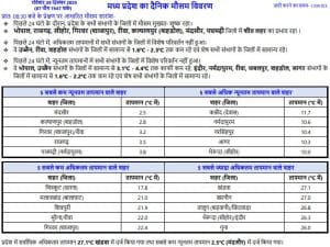 - उज्जैन, रीवा और शहडोल संभाग के जिलों में अधिकतम तापमान सामान्य से 2.3 डिग्री तक कम रिकॉर्ड किया गया।