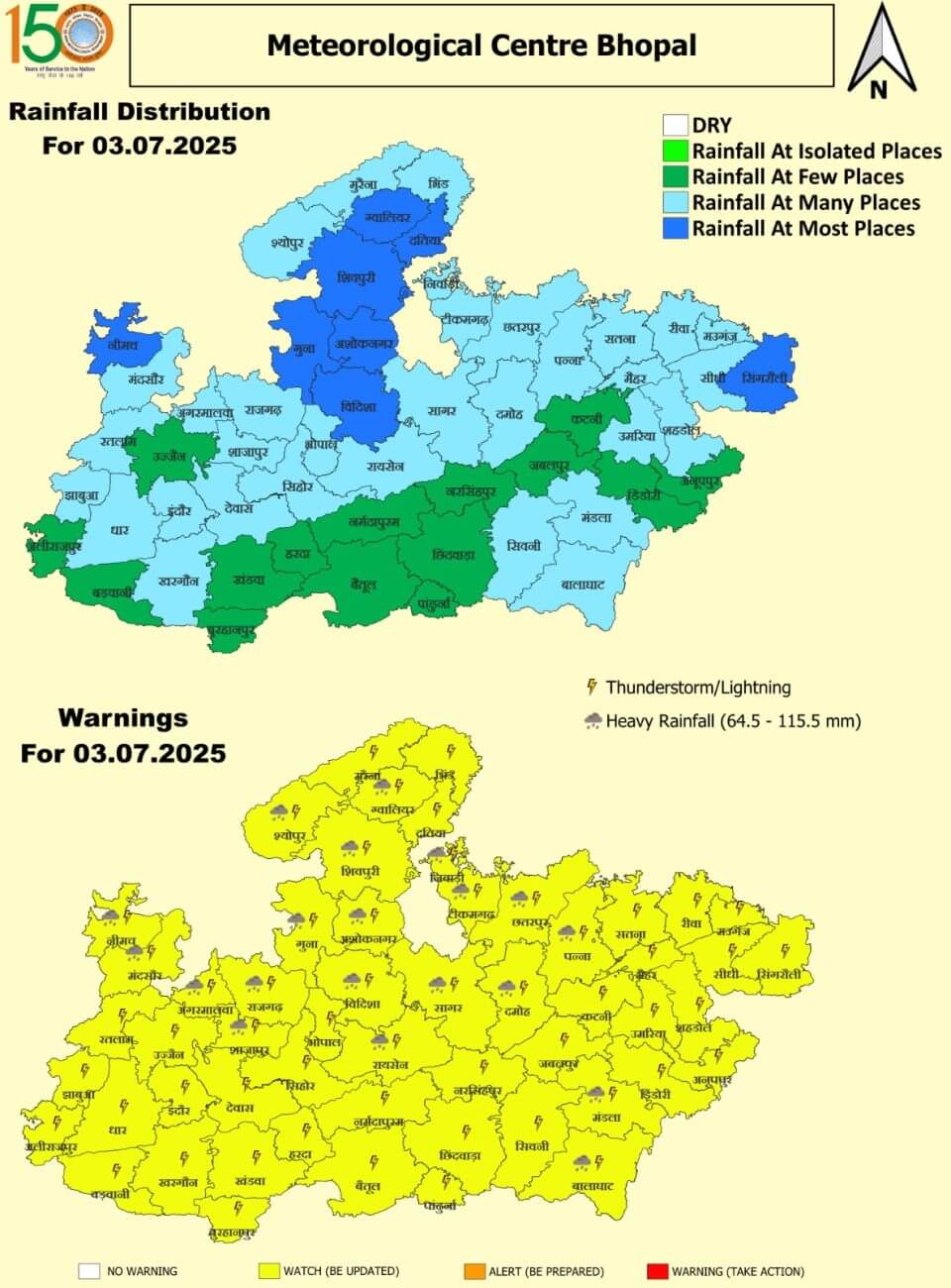 - गुरूवार 3 जुलाई: ग्वालियर, नीमच, मंदसौर, आगर-मालवा,राजगढ़, शाजापुर, श्योपुर, शिवपुरी, गुना, अशोकनगर, विदिशा, रायसेन, सागर, निवाड़ी, टीकमगढ़, छतरपुर, दमोह, पन्ना, मंडला और बालाघाट में भारी बारिश । भोपाल, इंदौर, उज्जैन, जबलपुर समेत बाकी के जिलों में हल्की से मध्यम बारिश यलो अलर्ट।