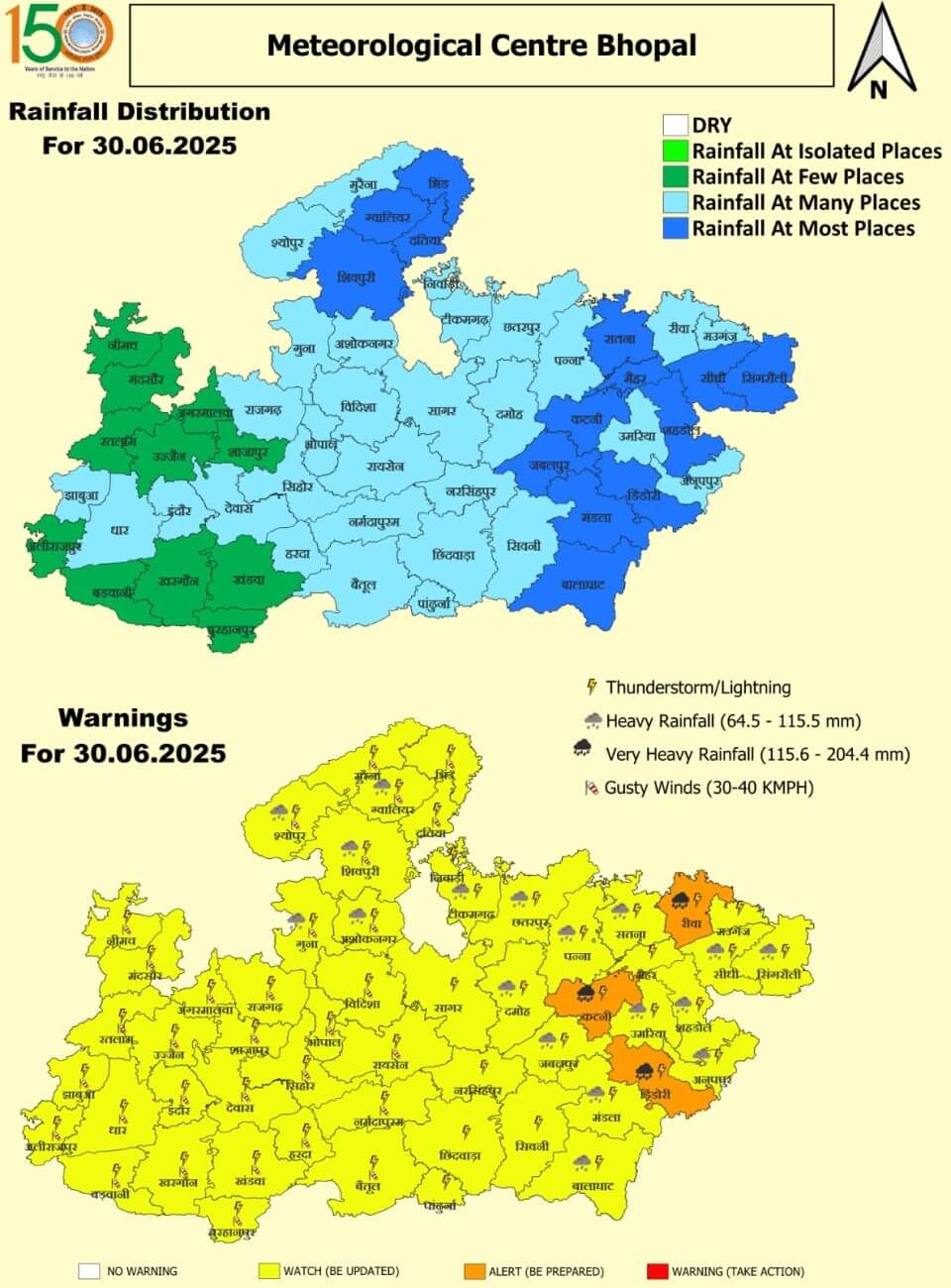 - सोमवार 30 जून: ग्वालियर, श्योपुर, शिवपुरी, गुना, अशोकनगर,विदिशा, सागर, रायसेन, राजगढ़, शाजापुर, आगर-मालवा, मंदसौर, नीमच, दमोह, निवाड़ी, टीकमगढ़, छतरपुर, पन्ना, मंडला और बालाघाट में भारी बारिश का अलर्ट ।भोपाल, इंदौर, उज्जैन, जबलपुर समेत बाकी के जिलों में हल्की से मध्यम बारिश का यलो अलर्ट ।