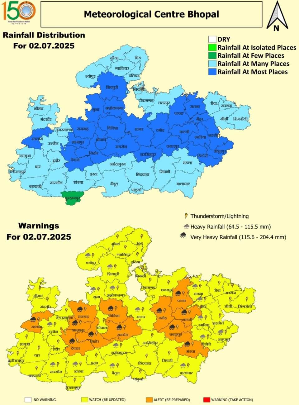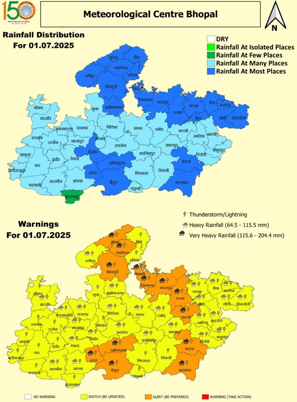 - बुधवार 2 जुलाई: रतलाम, राजगढ़, शाजापुर, देवास, सीहोर,विदिशा, रायसेन, पन्ना, दमोह, कटनी, जबलपुर और मंडला में अति भारी बारिश का ऑरेंज अलर्ट ।उज्जैन, श्योपुर, शिवपुरी, गुना, अशोकनगर, खरगोन, खंडवा, बैतूल, नर्मदापुरम, सागर, बालाघाट, अनूपपुर, डिंडौरी, उमरिया, मैहर और सतना में भारी बारिश ।