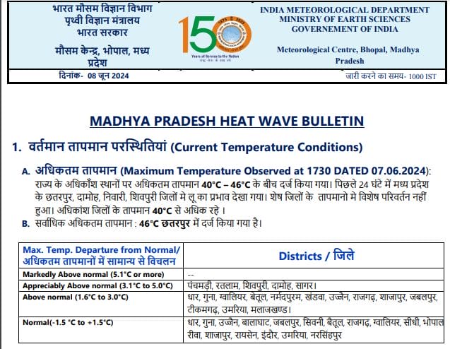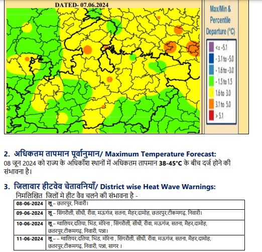 - बुरहानपुर, बड़वानी, झाबुआ, धार, इंदौर, देवास, पांढुर्णा, बालाघाट, बैतूल, हरदा, रतलाम, उज्जैन, छिंदवाड़ा, सिवनी और मंडला जिलों के लिए बारिश का ऑरेंज अलर्ट । 60 किलोमीटर प्रति घंटे की गति से हवा और ओलावृष्टि ।