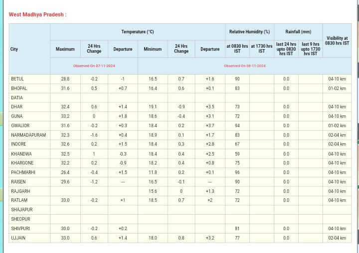 एमपी मौसम विभाग की मानें तो वर्तमान में प्रदेश में कोई बड़ा मौसम सिस्टम प्रभावी नहीं है, हालांकि हवाओं का रुख उत्तरी होने के कारण तापमान में गिरावट आने लगी है।अगले 24 घंटों के दौरान प्रदेश में मौसम शुष्क रहने के आसार है। तापमान में और गिरावट की संभावना है, और प्रदेश के अन्य हिस्सों में भी रात का तापमान और नीचे गिर सकता है।