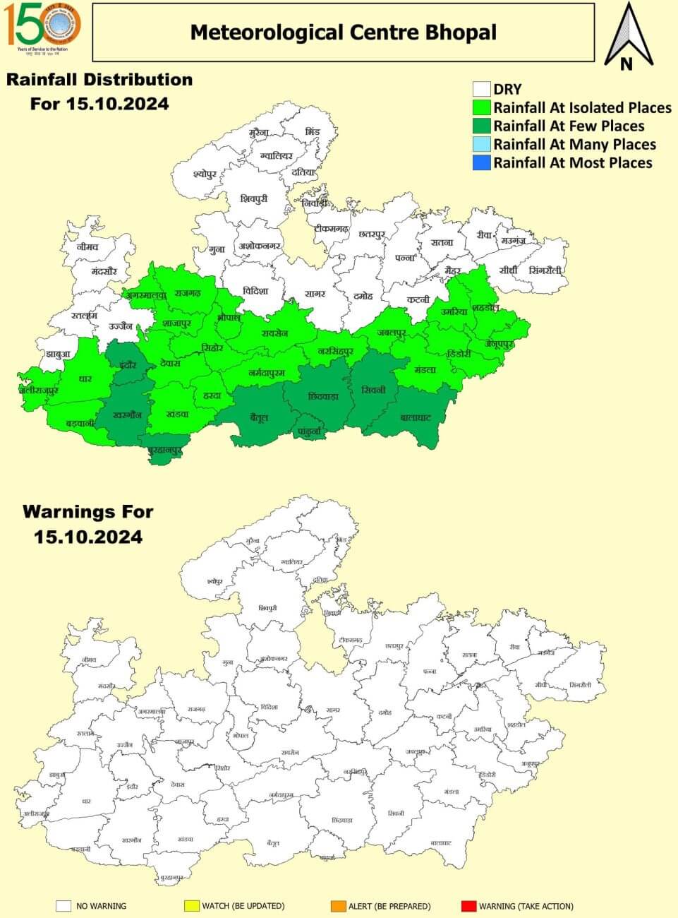 रविवार को कई जिलों में बारिश हुई और आज सोमवार को भी इंदौर-उज्जैन संभाग में बारिश की चेतावनी जारी की गई है।खंडवा, खरगोन, बुरहानपुर, बड़वानी, हरदा, देवास, इंदौर, धार, अलीराजपुर, नीमच में बिजली चमकने के साथ हल्की आंधी जारी रहने की संभावना है। ठंडी हवा से तापमान में गिरावट देखने को मिलेगी। संभवत: सामान्य से दो से तीन डिग्री तापमान नीचे रहेगा। 16 से 18 अक्टूबर के बीच बारिश की स्थिति कमजोर हो सकती है।