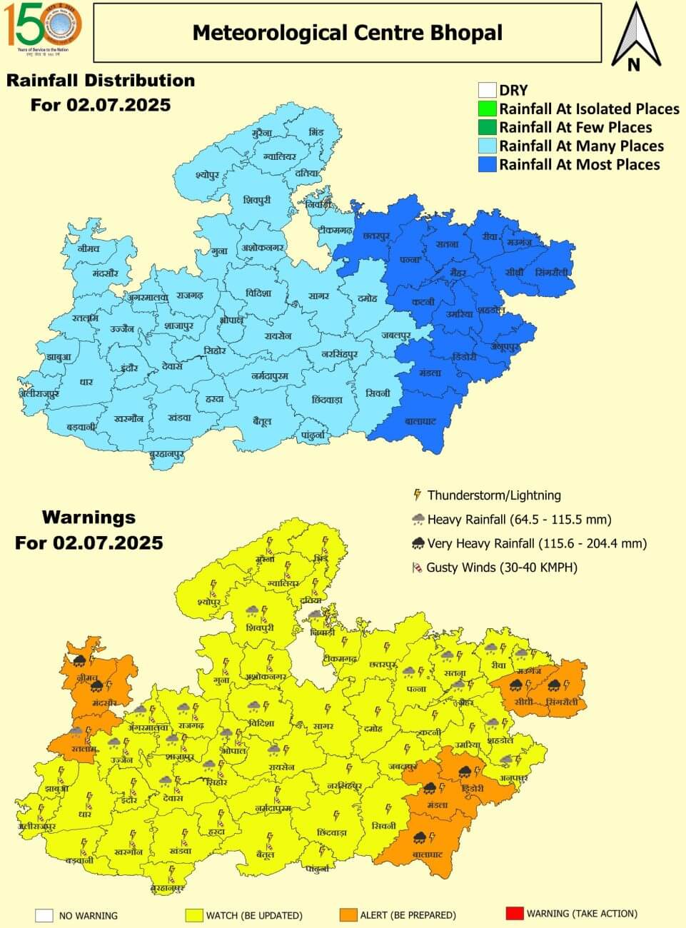 बुधवार 2 जुलाई : नीमच, मंदसौर, रतलाम, सीधी, सिंगरौली, मंडला,डिंडौरी और बालाघाट में अति भारी बारिश ।भोपाल, उज्जैन, आगर-मालवा, शाजापुर, राजगढ़, देवास, सीहोर, विदिशा, रायसेन, शिवपुरी, निवाड़ी, पन्ना, सतना, रीवा, मऊगंज, मैहर, शहडोल और अनूपपुर में भारी बारिश । इंदौर, ग्वालियर, जबलपुर समेत अन्य जिलों में बारिश का यलो अलर्ट ।