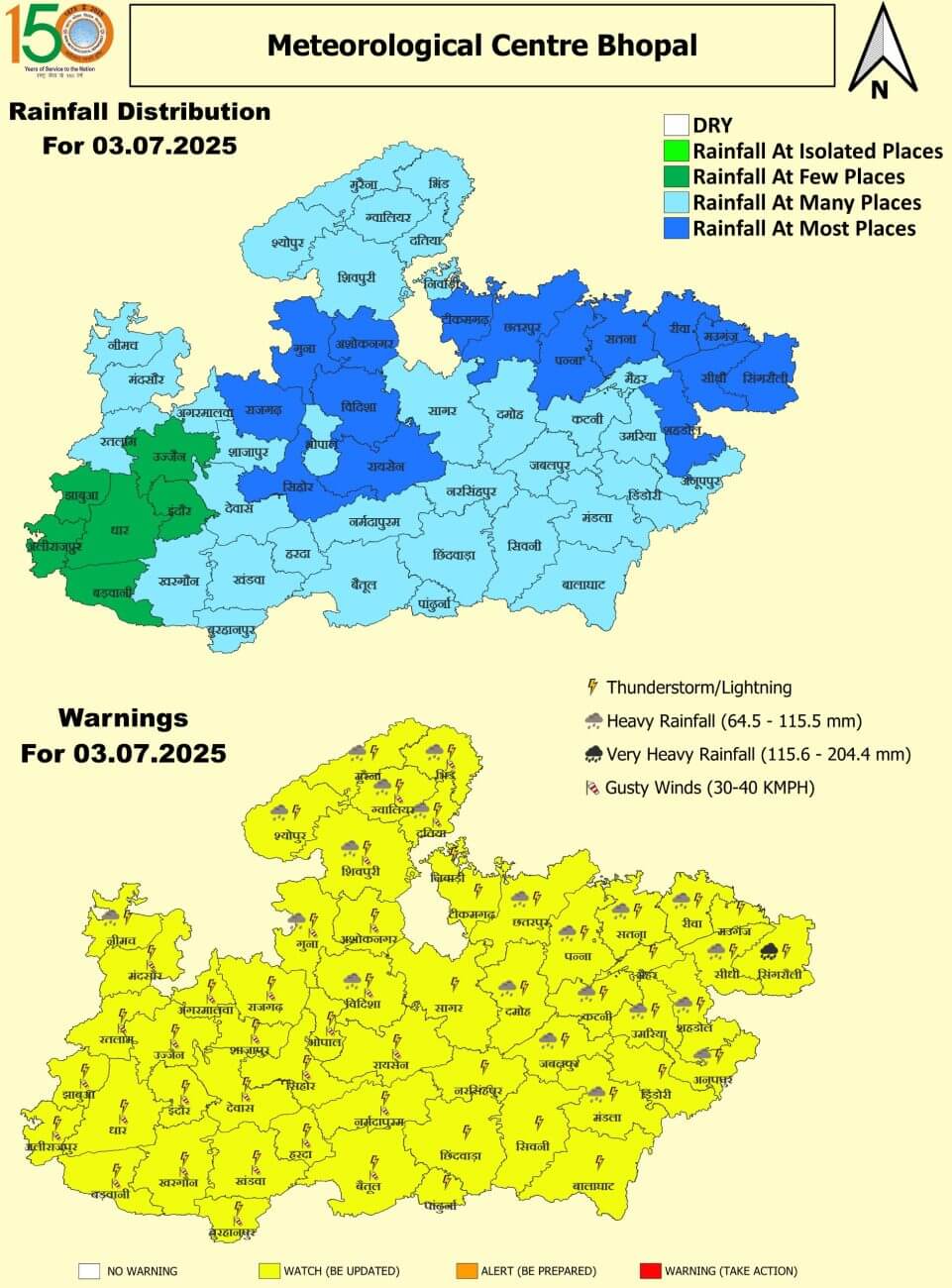 गुरूवार 3 जुलाई : सिंगरौली में अति भारी । ग्वालियर, भिंड, मुरैना, श्योपुर, गुना, विदिशा, नीमच, छतरपुर, दमोह, जबलपुर, पन्ना, सतना, रीवा, सीधी, कटनी, उमरिया, शहडोल, मंडला और अनूपपुर में भारी बारिश का अलर्ट।