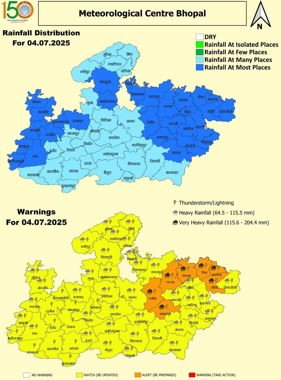 शुक्रवार 4 जुलाई : जबलपुर, दमोह, पन्ना, सतना, रीवा, मऊगंज और सीधी में अति भारी बारिश का ऑरेंज अलर्ट ।ग्वालियर, झाबुआ, रतलाम, नीमच, मंदसौर, धार, राजगढ़, हरदा, सीहोर, विदिशा, सागर, रायसेन, नर्मदापुरम, बैतूल, नरसिंहपुर, छिंदवाड़ा, पांढुर्णा, सिवनी, बालाघाट, मंडला, डिंडौरी, अनूपपुर, उमरिया, शहडोल, कटनी, मैहर, सिंगरौली, निवाड़ी, छतरपुर, गुना, अशोकनगर, शिवपुरी, श्योपुर, मुरैना, भिंड में भारी बारिश का अलर्ट