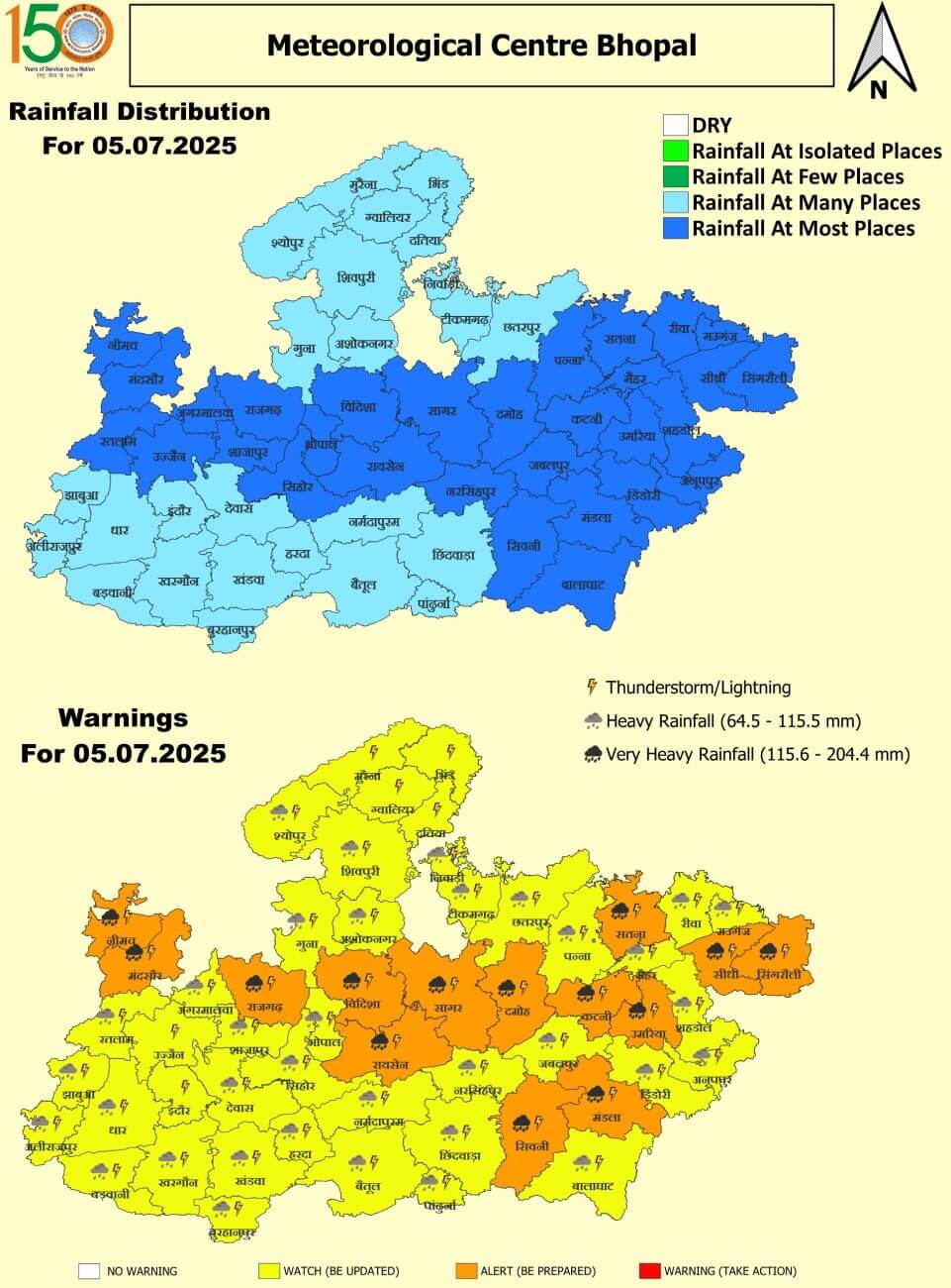 शनिवार 5 जुलाई : नीमच, मंदसौर, राजगढ़, विदिशा, रायसेन, सागर,दमोह, सतना, सीधी, सिंगरौली, कटनी, उमरिया, सिवनी और मंडला में अति भारी बारिश का ऑरेंज अलर्ट ।भोपाल, जबलपुर, रतलाम, झाबुआ, अलीराजपुर, बड़वानी, खरगोन, धार, आगर-मालवा, शाजापुर, देवास, खंडवा, बुरहानपुर, सीहोर, हरदा, नर्मदापुरम, बैतूल, नरसिंहपुर, छिंदवाड़ा, पांढुर्णा, बालाघाट, डिंडौरी, अनूपपुर, शहडोल, मऊगंज, रीवा, पन्ना, छतरपुर, टीकमगढ़, निवाड़ी, गुना, अशोकनगर, शिवपुरी, श्योपुर में भारी बारिश ।