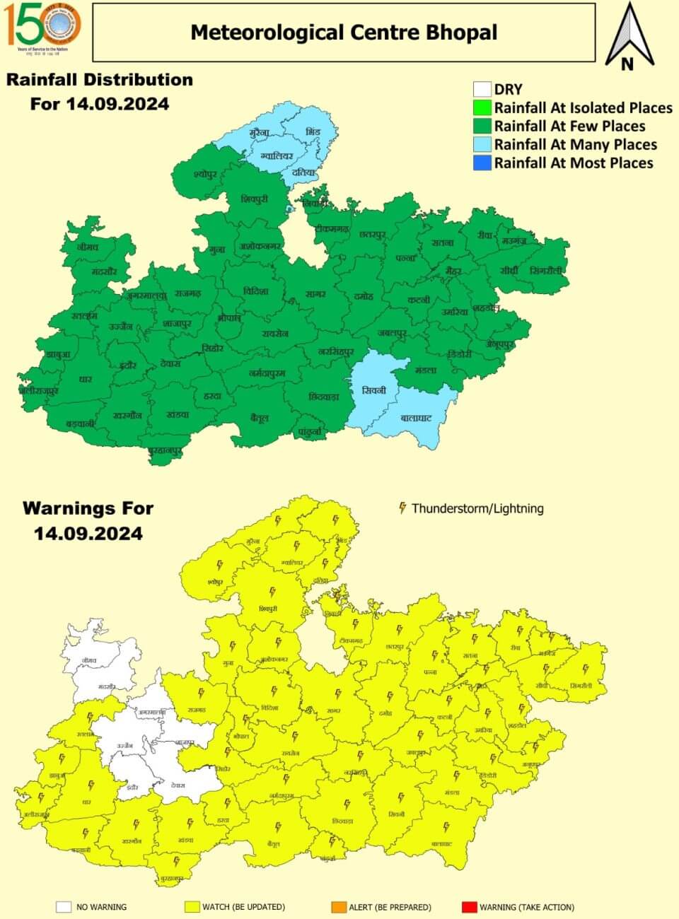 - ग्वालियर, चंबल, जबलपुर संभाग और कटनी, नरसिंहपुर, सिवनी, छिंदवाड़ा, बालाघाट, डिंडोरी, मंडला में कहीं-कहीं मध्यम बारिश हो सकती है।