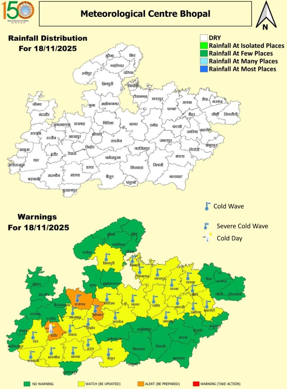 - रविवार-सोमवार की रात भोपाल, इंदौर, सीहोर, शाजापुर और राजगढ़ में तीव्र शीत लहर का प्रभाव