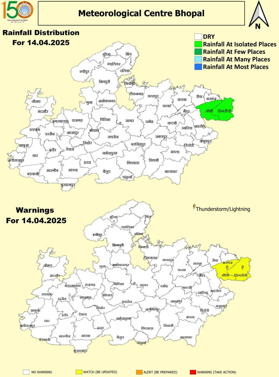 - रायसेन, हरदा, पचमढ़ी, छिंदवाड़ा, पांढुर्ना, विदिशा, सीहोर सागर, डिंडौरी, सीधी, मंडला, बालाघाट, सिंगरौली, देवास जिलों में आकाशीय बिजली, आंधी और हल्की बारिश ।