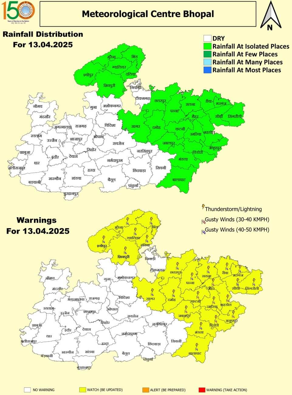 जबलपुर, ग्वालियर, दतिया, भिंड, मुरैना, श्योपुर, शिवपुरी, सागर, सतना, दमोह, छतरपुर, पन्ना, कटनी, जबलपुर, मैहर, उमरिया, मंडला, डिंडौरी, शहडोल, अनूपपुर, बालाघाट, रीवा, मऊगंज, सीधी और सिंगरौली जिले में गरज-चमक के साथ बारिश, आंधी और बिजली चमकने का अलर्ट।
