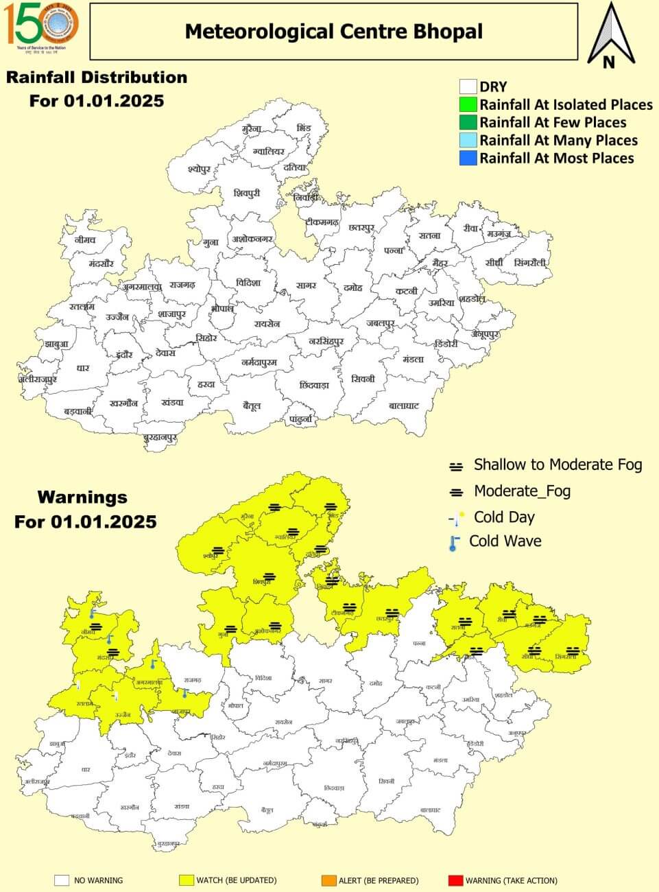 - प्रदेश के दमोह, जबलपुर, छतरपुर, सागर, टीकमगढ़, निवाड़ी, बालाघाट, भिंड, मुरैना, ग्वालियर, श्योपुरकलां, दतिया, पन्ना, कटनी, धार और बडवानी जैसे जिलों में हल्के से मध्यम कोहरा देखने को मिला।