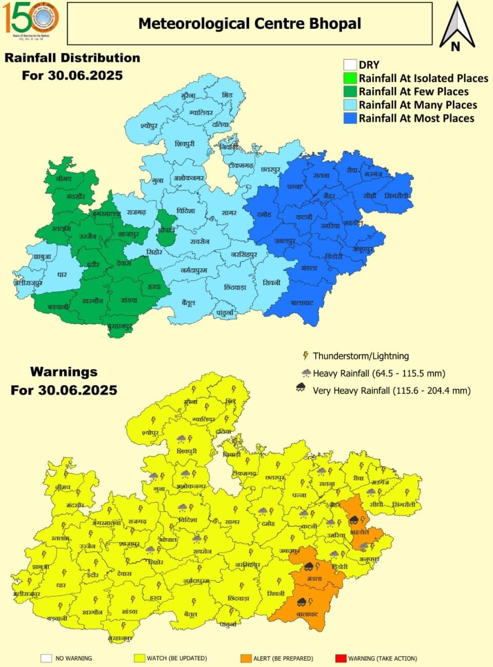 सोमवर 30 जून: मंडला, बालाघाट और शहडोल में अति भारी बारिश का ऑरेंज अलर्ट।सीहोर, विदिशा, रायसेन, गुना, अशोकनगर, शिवपुरी, दमोह, कटनी, उमरिया, डिंडौरी, अनूपपुर, सतना, सीधी में भारी बारिश ।बाकी जिलों में भी बारिश ।