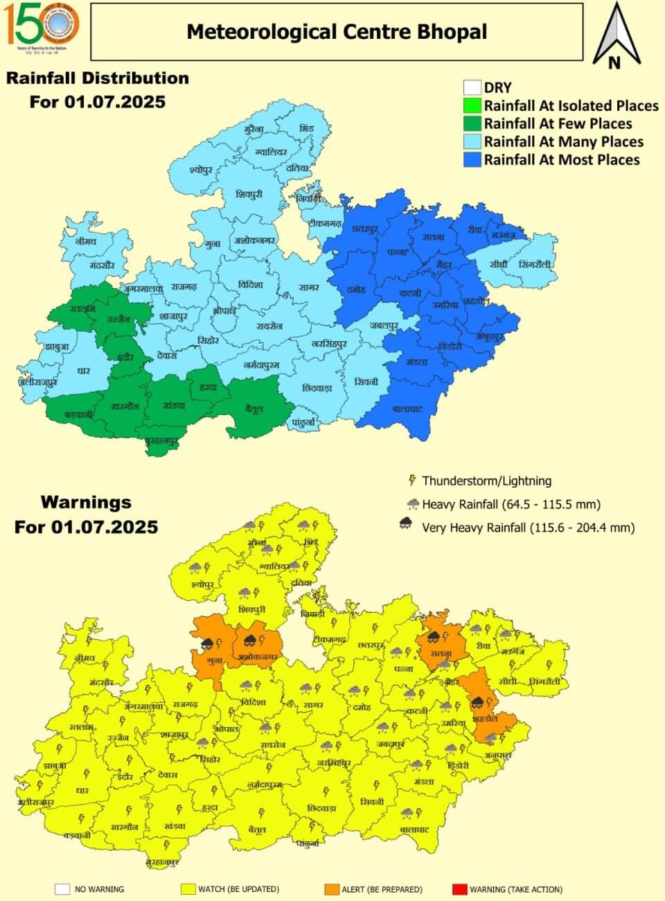 मंगलवार 1 जुलाईः गुना, अशोकनगर, सतना, शहडोल में अति भारी बारिश का अलर्ट ।ग्वालियर, जबलपुर, श्योपुर, मुरैना, भिंड, शिवपुरी, सीहोर, विदिशा, सागर, रायसेन, नरसिंहपुर, बालाघाट, मंडला, डिंडौरी, अनूपपुर, कटनी, दमोह, पन्ना, रीवा, मऊगंज में भारी बारिश । भोपाल, इंदौर, उज्जैन में भी बारिश का दौर।