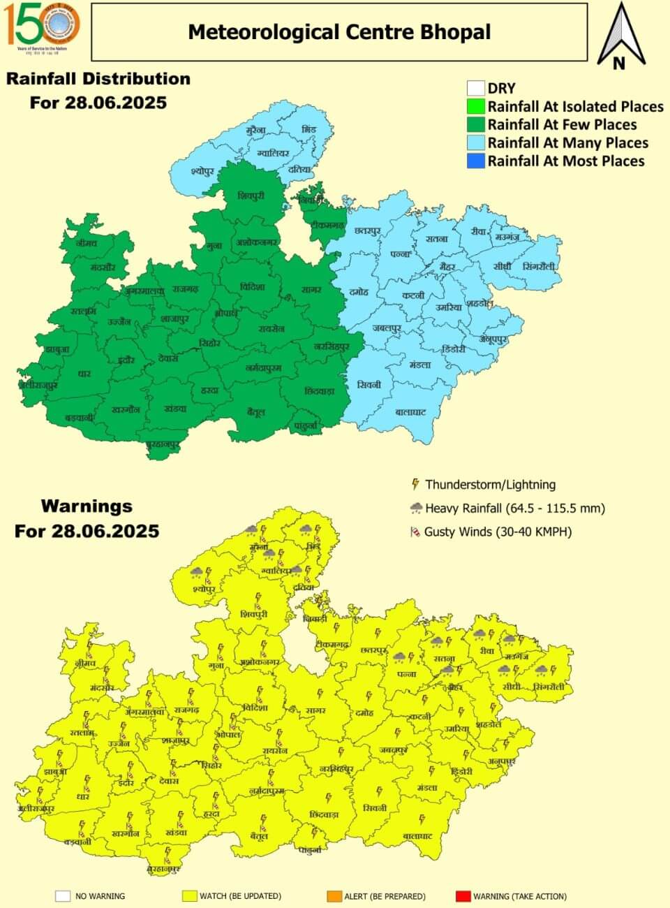 शनिवार 28 जून: ग्वालियर, श्योपुर, मुरैना, भिंड, दतिया, पन्ना, सतना, मैहर, रीवा, मऊगंज, सीधी और सिंगरौली में भारी बारिश ।भोपाल, इंदौर, उज्जैन, जबलपुर समेत प्रदेश के अन्य जिलों में बारिश का यलो अलर्ट।