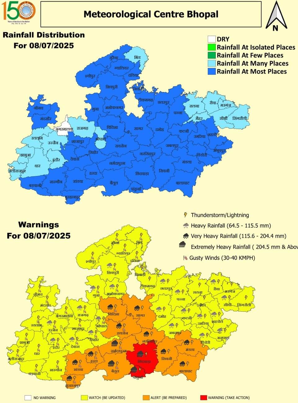 - मंगलवार 8 जुलाई: छिंदवाड़ा और पांढुर्णा में अति भारी बारिश का रेड अलर्ट । विदिशा, सागर, रायसेन, नर्मदापुरम, बैतूल, हरदा, खंडवा, बुरहानपुर, नरसिंहपुर, सिवनी, मंडला और बालाघाट में अति भारी बारिश का ऑरेंज अलर्ट। इंदौर, उज्जैन, भोपाल, राजगढ़, देवास, गुना, सीहोर, अशोकनगर, शिवपुरी, छतरपुर, पन्ना, दमोह, जबलपुर, कटनी, रीवा, सीधी, उमरिया, शहडोल, डिंडौरी और अनूपपुर में भारी बारिश ।