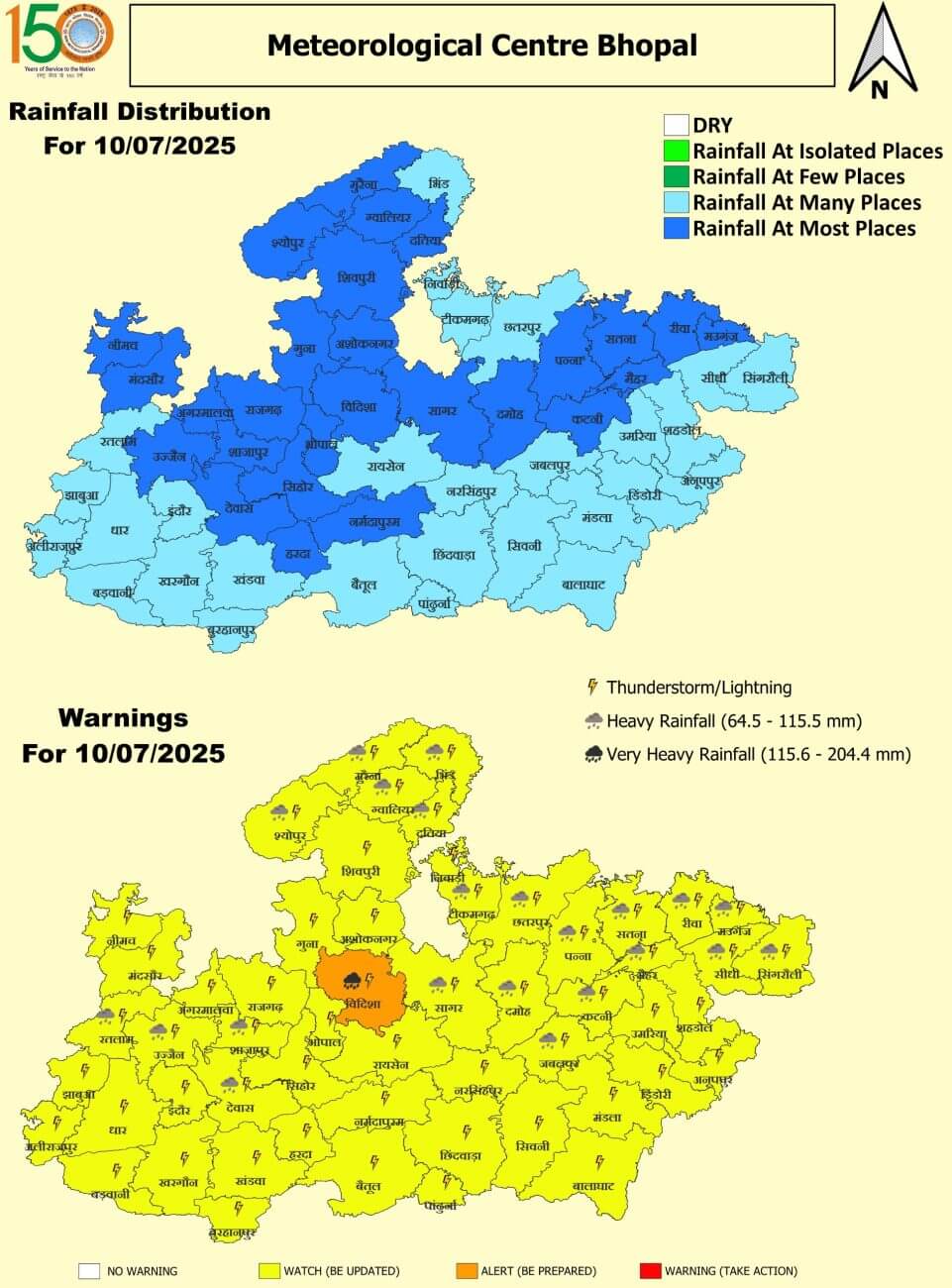 - बुधवार 9 जुलाई: इंदौर, देवास, झाबुआ, धार, बड़वानी, खरगोन,खंडवा, बुरहानपुर, हरदा, नर्मदापुरम, बैतूल, छिंदवाड़ा और पांढुर्णा में अति भारी बारिश का ऑरेंज अलर्ट।नीमच, मंदसौर, रतलाम, उज्जैन, आगर-मालवा, राजगढ़, शाजापुर, सीहोर, भोपाल, रायसेन, सागर, नरसिंहपुर, विदिशा, गुना, अशोकनगर, शिवपुरी, श्योपुर, मुरैना, ग्वालियर, भिंड, दतिया, सिवनी, डिंडौरी, अनूपपुर, कटनी और उमरिया में भारी बारिश ।