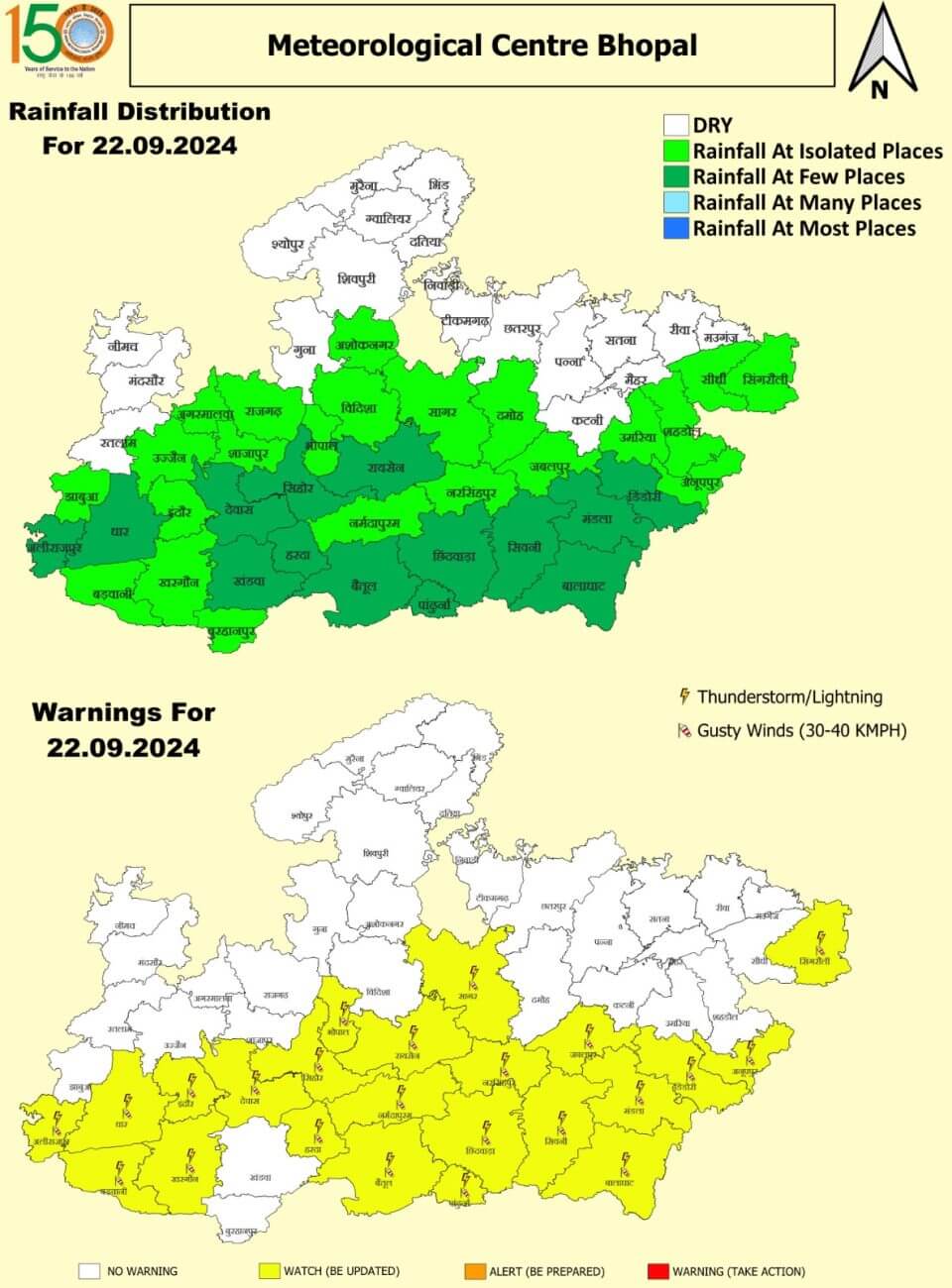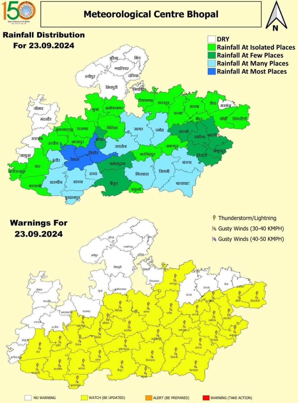 खासकर 23 सितंबर से मानसून के दोबार एक्टिव होने से कई जिलों में झमाझम बारिश होगी और हवा की स्पीड 50 किलोमीटर प्रतिघंटा तक देखी जा सकती है।इस दौरान रीवा शहडोल समेत पूर्वी मध्य प्रदेश में भी बारिश की संभावना जताई गई है।