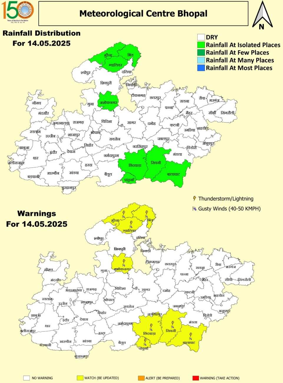 - 14 मई बुधवार : ग्वालियर, मुरैना, भिंड, अशोकनगर, पांढुर्णा, छिंदवाड़ा, सिवनी और बालाघाट में गरज-चमक वाली स्थिति