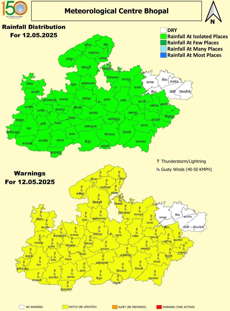 - 12 मई सोमवार : भोपाल, इंदौर, जबलपुर, उज्जैन-ग्वालियर समेत प्रदेश के ज्यादातर हिस्से में बारिश/आंधी । सतना, रीवा, मऊगंज, सीधी और सिंगरौली में मौसम साफ।