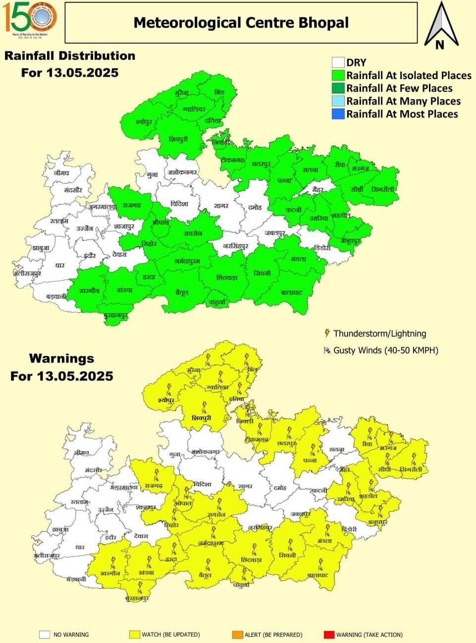 - 13 मई मंगलवार : भोपाल, ग्वालियर, श्योपुर, मुरैना, भिंड, शिवपुरी, दतिया, निवाड़ी, टीकमगढ़, छतरपुर, पन्ना, रीवा, मऊगंज, सीधी, सिंगरौली, उमरिया, शहडोल, अनूपपुर, मंडला, बालाघाट, सिवनी, छिंदवाड़ा, पांढुर्णा, रायसेन, नर्मदापुरम, बैतूल, राजगढ़, सीहोर, हरदा, खंडवा, बुरहानपुर, खरगोन, राजगढ़ में हल्की बारिश-आंधी।