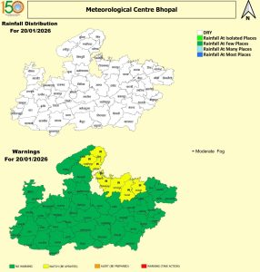 - एक तीव्र पश्चिमी विक्षोभ के 21 जनवरी की रात से उत्तर-पश्चिम भारत को प्रभावित करने की भी संभावना है। इसके प्रभाव से 23 जनवरी के बाद मध्य प्रदेश के मौसम में बदलाव देखने को मिल सकत है।ग्वालियर, चंबल, रीवा और सागर संभाग में बादल छाने के साथ हल्की बारिश या बूंदा-बांदी की स्थिति बन सकती है। इसके अलावा ग्वालियर, दतिया, भिंड, मुरैना और छतरपुर जिलों में सुबह के समय घना कोहरा छाने की संभावना है। जनवरी अंत में तापमान में गिरावट आने से ठंड का एक और दौर देखने को मिल सकता है।
