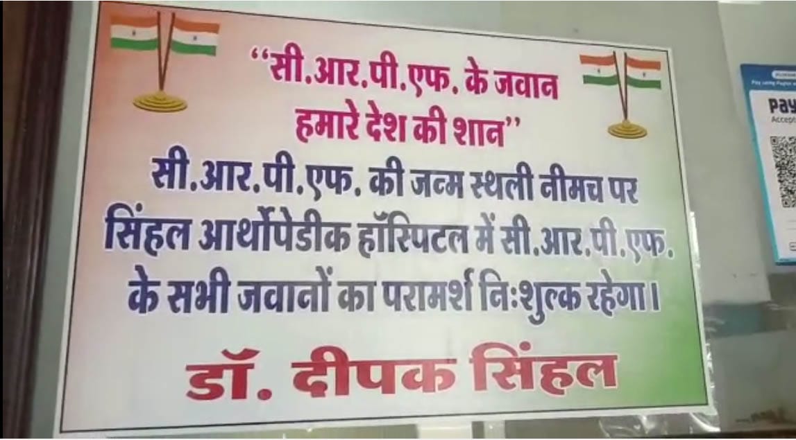 नीमच, कमलेश सारडा। देश पर मर मिटने वाले सीआरपीएफ के जवानों के लिए नीमच (Neemuch) के डॉक्टर दीपक सिंहल (doctor deepak singhal) की अनूठी पहल की है। डॉक्टर दीपक सिंहल हड्डी रोग वेशेषज्ञ है। इनके हॉस्पिटल में आने वाले सीआरपीएफ के जवानों से यह परामर्श शुल्क नही लेते है।