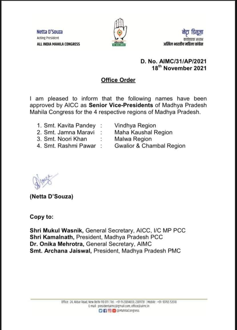 नियुक्ति आदेश के मुताबिक अखिल भारतीय महिला कांग्रेस ने कविता पांडे, जमना मरावी, नूरी खान और रश्मि पवार को मध्य प्रदेश महिला कांग्रेस की वरिष्ठ उपाध्यक्ष मनोनीत किया है। पार्टी ने कविता पांडे को विंध्य रीजन, जमना मरावी को महाकौशल रीजन , नूरी खान को मालवा रीजन और रश्मि पवार को ग्वालियर चम्बल रीजन की जिम्मेदारी सौंपी है।
